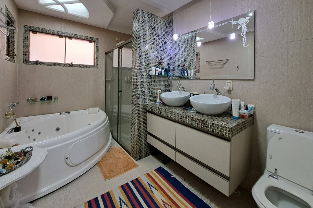 Belíssima casa COM SACADA, SUÍTE, MEZANINO, ESPAÇO GOURMET, 4 dormitórios sendo 3 suítes, sala de estar e jantar e tv, 5 banheiros, 4 vagas de garagem, banheira de hidromassagem, cozinha, lavanderia, quintal, espaços amplos e bem iluminado proporcionando conforto e bem estar.